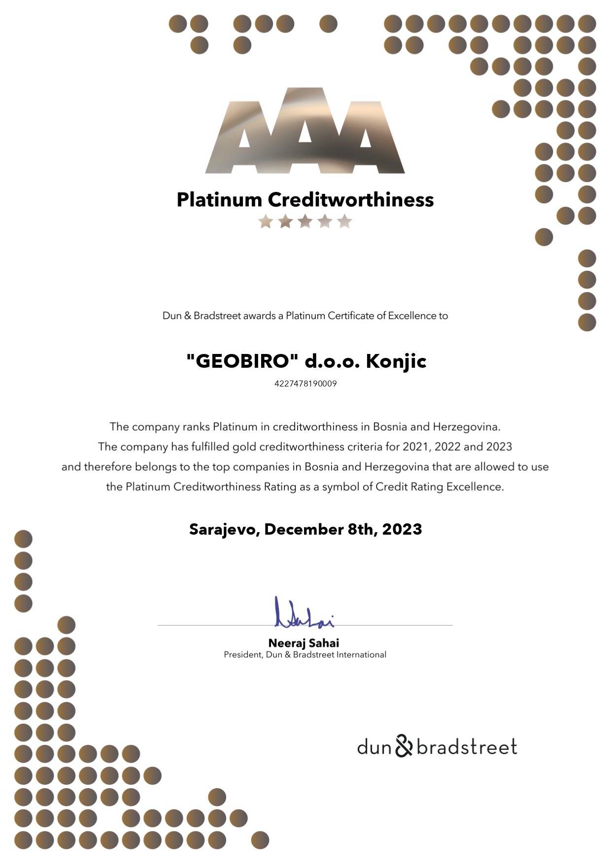 Platinum certifikat bonitetne izvrsnosti